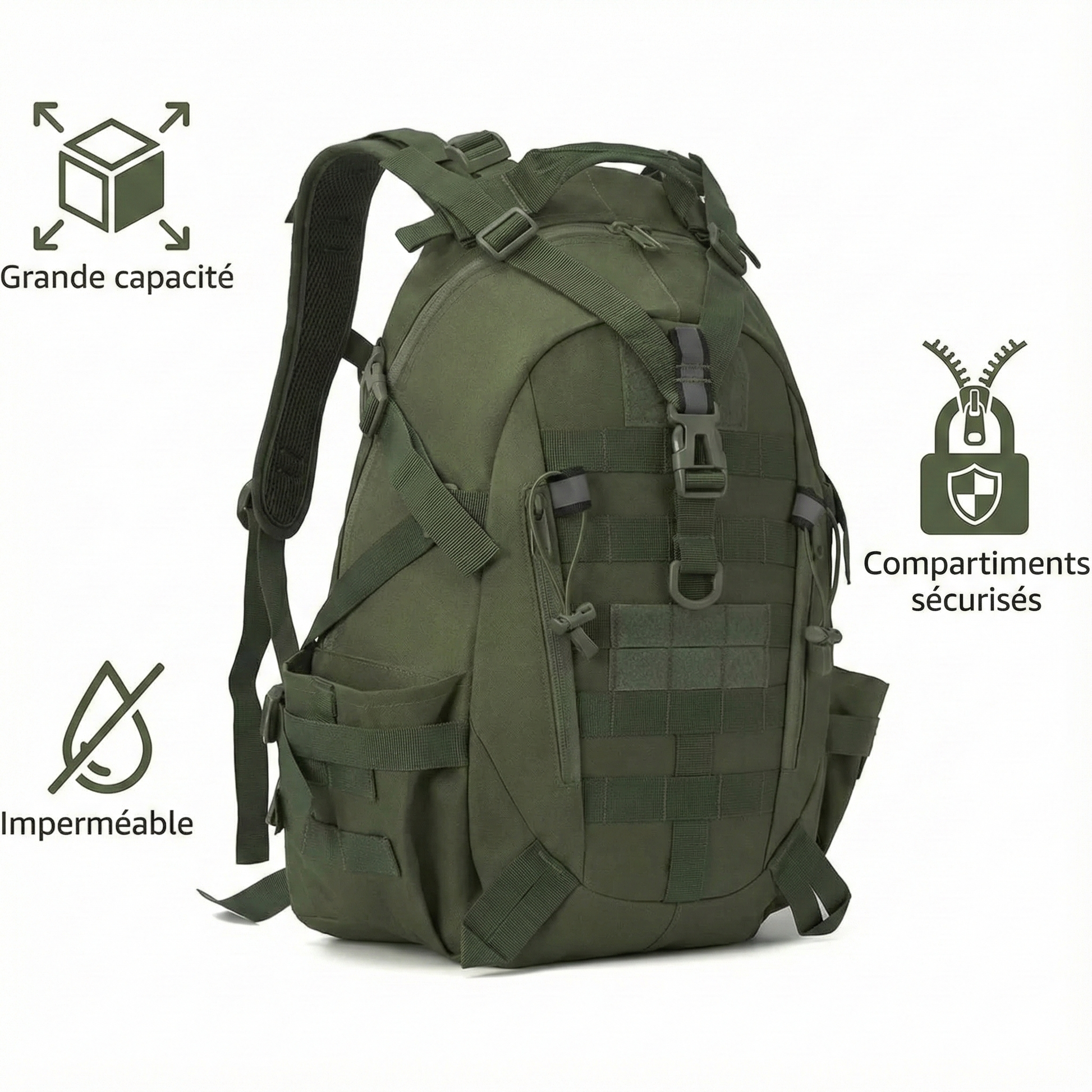 Ce sac à dos de randonnée 40 litres en polyester 600D résistant à l'eau accompagne vos escapades nature et vos voyages prolongés. Sa capacité généreuse absorbe l'équipement d'un weekend complet : vêtements de rechange, provisions, matériel photo, trousse de toilette et même un ordinateur portable protégé dans son compartiment dédié. Le tissu jacquard 600 deniers repousse les éclaboussures et résiste aux frottements contre les rochers ou les sièges de transport. Les bretelles à système coussin d'air distribuent le poids sur vos épaules et votre bassin, transformant 8 kg de charge en sensation supportable même après trois heures de marche. Les multiples poches extérieures donnent un accès instantané à votre gourde, carte ou snack sans décharger le sac. Son design sobre traverse les environnements sans attirer l'attention superflue.